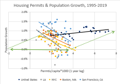 The black dots in Figure 4 and the black trendline show US permits and population growth over time. Those dots and that trendline are also in Figure 5. Nationally, population growth tends to be stable over time, so practically all the changes in housing production are cyclical, so the trendline is flat. The plots over time for the Closed Access cities are shown in Figure 5. The more homes they build, the faster they shrink.
