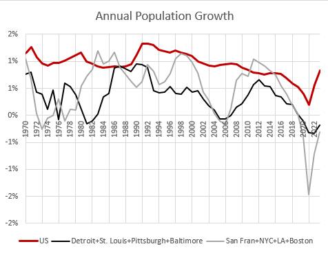 This framework makes sense. And we do see places where prices have grown a lot but population growth has been low and vice versa. We can all agree on these things.