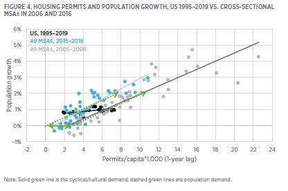 Their paragraph above describes a reasonable, plausible world that isn’t relevant to the question they are asking. It is a piece of the puzzle, but it isn’t driving the narrative. The expensive cities with rising incomes are shrinking or growing very slowly and countercyclically. Their growth rate is much nearer to cities where demand growth has been lower than they are to the national average.