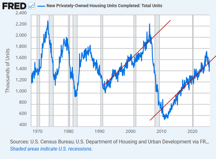 Even in the 2000s that everyone thinks produced a glut of homes, capacity growth followed the same path. In the 1970s and 1980s and from 2012 to 2015, there was cyclical capacity recapture that could happen more quickly. More generous underwriting will turn more of those units into owned units. YIMBY reforms will turn more of them into multi-family and in-fill. And, in the meantime, blocking large scale investment in single-family rentals might just stop the linear rise in completions before it gets to a sustainable rate.