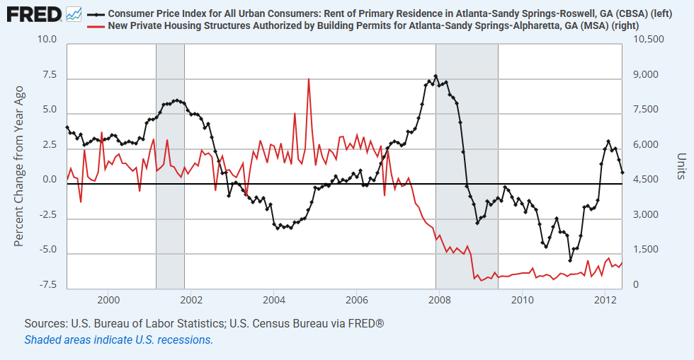 As I mentioned in the previous post, it actually isn’t coherent to ask what the elasticity of demand would need to be to make home prices decline as much as they did in Atlanta. It isn’t coherent because there was no measurable spike in supply in Atlanta. In fact, rental vacancies had peaked in Atlanta by 2004. Then, by 2006, construction of new homes was already declining. And, in 2006 and 2007, rent inflation started increasing (Figure 2, black) in Atlanta while vacancies and construction (Figure 2, red) were declining.