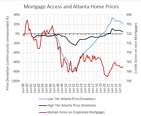 Here are my estimates of deviations from a neutral price/income ratio at the end of each quarter in a typical Atlanta ZIP code with current average income of $50,000 and current average income of $150,000. And, I have added the median credit score on new mortgages, tracked by the New York Fed quarterly.