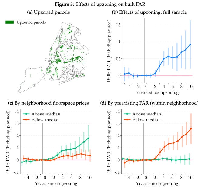 Figure 3 from the paper quantifies the effects he found. Upzoned parcels started the period with a built FAR (floor area ratio - the proportion of floor space allowed on the parcel relative to the size of the parcel) of 1.3. On average, upzoned parcels increased FAR by nearly 0.1 over the following decade. Parcels with above-average value added nearly 0.2 points and parcels with below average density added more than 0.2 points.