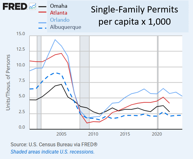 Omaha, Atlanta, Orlando, and Albuquerque, and almost every other metro area from 100,000 population to 10 million suddenly and coincidentally reached a mature stage in their development? Those commutes in Omaha became untenably long at exactly the same moment that Orlando suddenly became geographically hemmed in by the Gulf of Mexico and the Atlantic Ocean?
