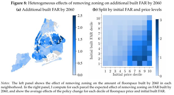 Figure 8 from the paper highlights where increased density would likely occur under broad upzoning. In zoned American cities, city centers have a lot of room to densify, but having frozen our cities in amber for a century, it is the few miles around city centers that have remained at very low densities that would likely develop the most. He estimates that most of the upzoning would be in parts of Brooklyn and Queens plus a couple of the least dense pockets of Manhattan.