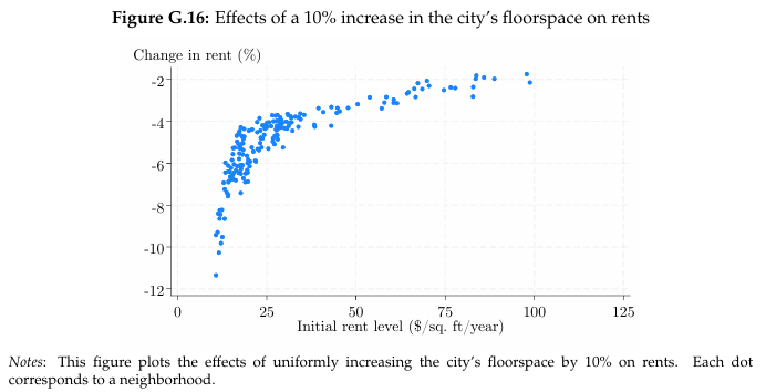 This still seems low - a 10% increase in floorspace leading to about a 5% decrease in rents, on average.