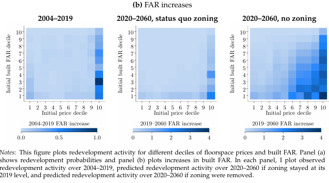 In the next figure, he demonstrates the effect of upzoning across both dimensions - density and value. After upzoning, expect very little redevelopment in dense, low-value parcels, and significant redevelopment in the least dense, high-value parcels.