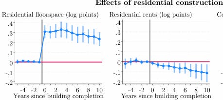 One reason for the underwhelming result is that the effects of supply are distributed broadly throughout the region. In fact, it wouldn’t have surprised me if he had found no local rent effects or even some positive rent trends in the very local area.