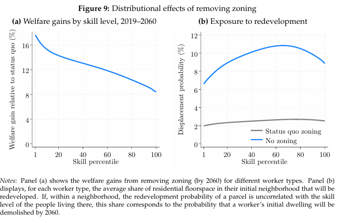 Figure 9 from the paper estimates welfare gains by skill level and the potential for displacement caused by redevelopment. This is over a 40 year period. Again, as far as I can tell, the author treats all migration as aspirational and utilitarian migration from spatial equilibrium models and isn’t accounting for the fact that more than 1% of existing residents with below median incomes are regionally displaced in a typical year under current conditions, and that much of the elevated rent is due to families paying high rents to avoid displacement. With no redevelopment, probably something around half of low-skill-level residents would be regionally displaced by 2060. So, I think the right panel of Figure 9 greatly understates the benefits of upzoning. Given the current rates of regional displacement, I think it is mathematically implausible that redevelopment would increase local displacement more than it would decrease regional displacement. I think his model here assumes all migration triggered by redevelopment or the lack of it is internal, but I might have missed something.