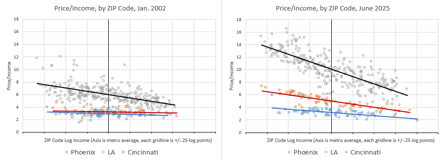 Figure 5 compares Cincinnati, Phoenix, and Los Angeles in January 2002 and June 2025. In 2002 (left panel), in both Phoenix and Cincinnati, new home supply wasn’t completely inelastic, so the price of homes relative to incomes was uniform across time and cross-sectionally across incomes. Where new homes of some form aren’t outlawed, incomes and home prices trend in parallel over time. Cincinnati and Phoenix are both on the horizontal portion of Figure 3. Supply was basically perfectly elastic in both. More demand had little price effect. It was all quantity. Phoenix had higher demand. Phoenix built more. They were equally affordable.