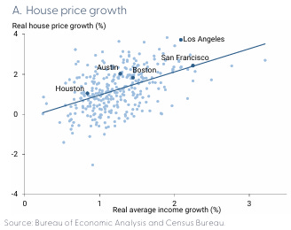 Places where economic growth translates into strong demand for highly skilled workers, such as San Francisco, will tend to have more growth in house prices and less growth in housing supply relative to places where there is very little income growth but significant growth in middle- or low-income jobs, like Houston. Critically, these growth dynamics are independent of housing supply constraints and so are more likely to reflect deeper trends in the underlying drivers of economic growth.