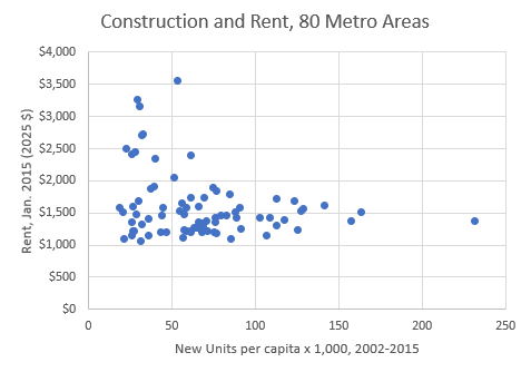 Figure 2 shows the relationship between construction rates and rent inflation among 80 metro areas since 2015. There is none.