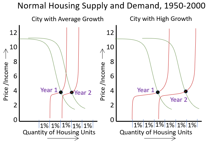 By the turn of the century, the Closed Access cities (NYC, LA, San Francisco/San Jose, Boston, and San Diego) had supply curves stuck in the left-hand panel of Figure 3 regardless of demand. So, intersection of supply and demand has crept higher until now, in those cities, demand is at the top of the curve where the demand curve flattens out.