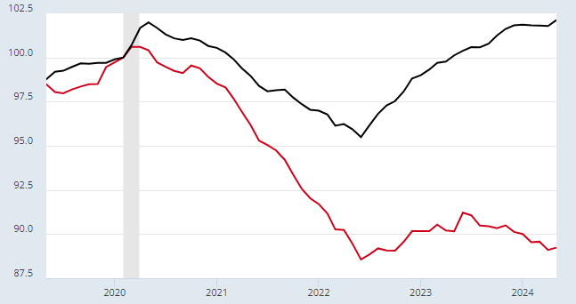 Figure 1 is a chart of real rents for the US (black) and for one metro area (red) which I will name later.* Should we use deflating rents here to claim a YIMBY win?