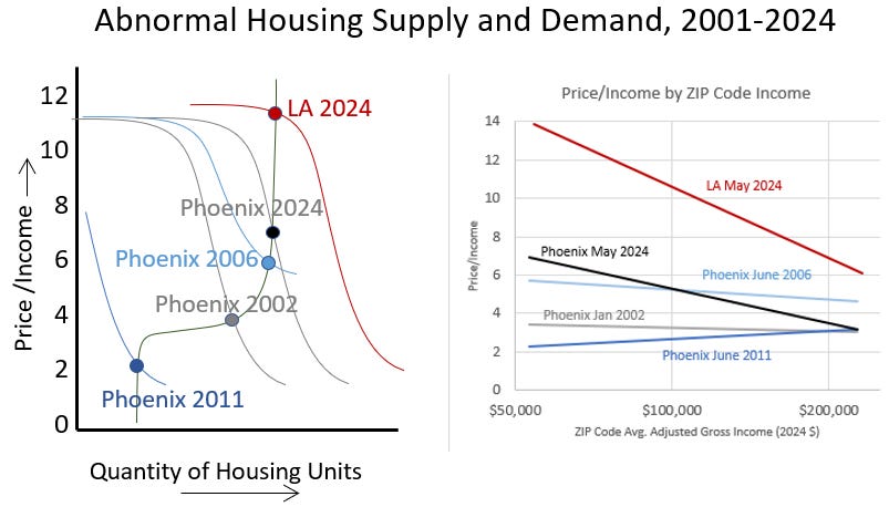 Phoenix in 2002 was still comfortably in the right panel of Figure 3 - building a lot of homes and remaining moderately affordable across the city. Then, the outpouring of families out of LA (the individuals acting out their elastic demand for housing in LA) pushed demand up in Phoenix beyond its supply capabilities. That pushed the demand curve in Phoenix to where it was in 2006.