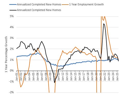 Figure 3 shows the same measures as a percentage of the existing stock of homes and also includes the 1 year growth rate in employment, which tracks pretty well as a leading estimate of the number of homes required to maintain neutral rent.