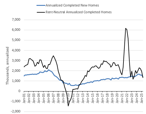 Figure 2 compares the annualized number of completed new homes to the number that would hypothetically be required to keep rent inflation equal to core non-shelter inflation.