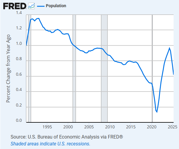 We’ve sort of been putting together a natural experiment. In Trump’s first term, first immigration declined, then the Covid pandemic briefly almost took population growth to zero. Then, there was a recovery in population growth and a pendulum swing back to strong net immigration during the post-Covid Biden boom. But, by 2024, either from natural mean reversion or from Biden administration attempts to slow immigration, population growth started to slow down.