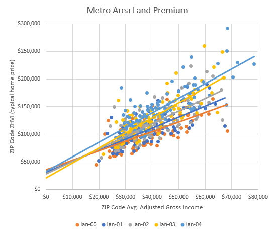 So, in the typical ZIP code with average income of $60,000, in January 2000, the typical home cost about $25,000 plus 1.7 x 60,000. In January 2002, it was about $25,000 plus 2.3 x 60,000. In January 2004, it was about $25,000 plus 2.7 x 60,000.