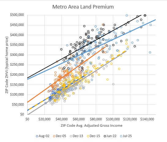 That period was cyclically ascendant. So, each year, home prices increased proportionately across the region. Here, that means that the pattern of prices across ZIP codes is tethered at the left end. Think of this as the value of a marginal lot carved out of farmland on the city’s edge, with access to utilities but no particular locational value. In this city, that tended to be between $20,000 and $30,000.