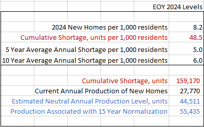 The next step in the model is using the lot premium to estimate the amount of construction required to keep rent inflation neutral. In the sample city, by the mid 2010s, demand from population growth and household formation had returned to levels similar to the 2000s. Construction rates were growing, but couldn’t grow quickly enough to meet the demand that returned as the economy returned to expansion. Then supply chain disruptions associated with Covid and with competition for resources from the AI boom and construction of manufacturing facilities further delayed growth of new home construction.