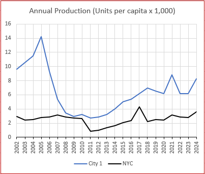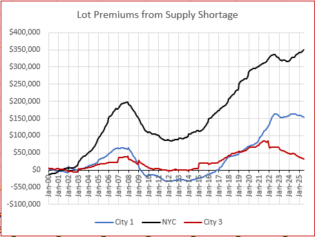Figure 4 compares the lot premium for this city with the lot premium for New York City. I have also added a third city, to demonstrate the various paths cities have taken since 2000. Lots in New York City are perpetually inflated because supply constraints create elevated rents, and elevated rents justify paying a premium for land.
