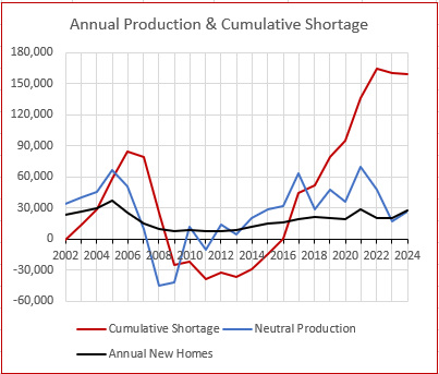 Every market has a different lot premium. Every city has a different neutral production level, associated with flattening rent inflation and flattening lot premiums. Every city has a different distance between current production and neutral production.