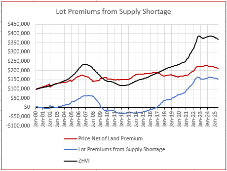 Figure 7 shows the price of the typical home in the sample city over time (the ZHVI, tracked by Zillow). It disaggregates that value between the lot premium (blue line) and traditional sources of value, like size, quality, and location (red line). Nearly half the price of the typical home in the sample city is now associated with the unsustainable premium.