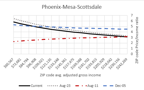 The price/income ratio of every neighborhood in Phoenix today is mostly a product of where neighborhood income falls on that line, plus some idiosyncratic differences between neighborhoods. The idiosyncrasies used to be everything. Now they are a minority of the explanation for a given home’s value.