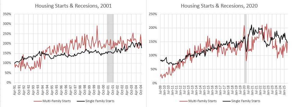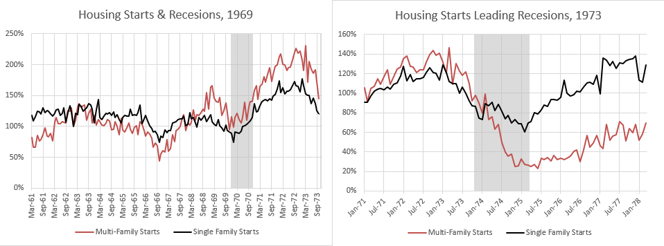 Figure 2 shows trends in housing starts for single-family and multi-family housing in the recessions of 1969 and 1973. What I would note here is that the impulse is similar in both multi- and single-family activity, in both time and scale. Declining starts lead the recession in both, and recovery signals the end of the recession in both.