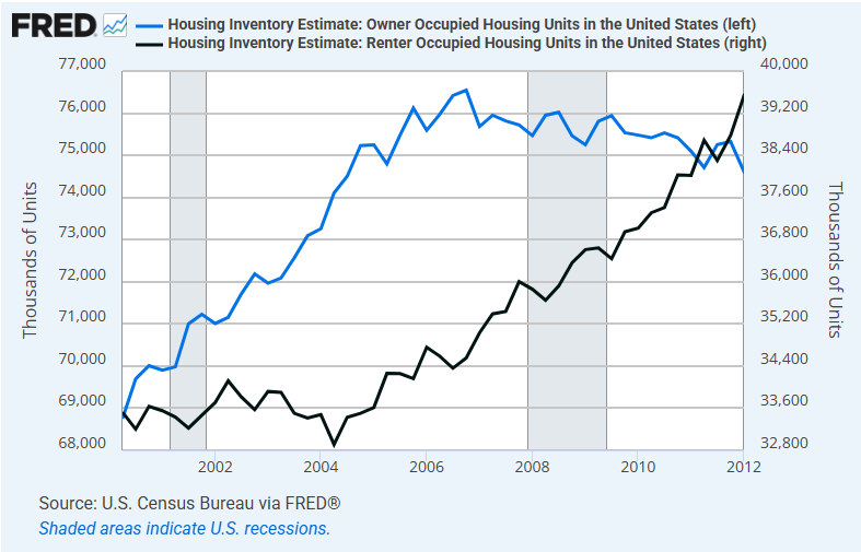 Around 2004 or 2005, there was a shift. Before then, a bit more than 1 million households were becoming homeowners each year. By the end of 2005, even while the private securitization boom was hot, that flatlined. After 2004, there were about 1 million households a year becoming renters. (Figure 6).