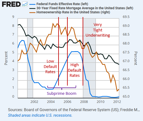 The story about what caused the 2008 crisis had already been carved in stone by 2006, and any details that didn’t match the story were universally ignored. To this day, oddly, some people continue to believe that the crisis was caused by rate resets on floating rate mortgages because that story had been written by 2006. The mortgages that had high default rates were generally taken out when rates were at their highest and then interest rates declined precipitously. See Figure 5. But, the story was written.