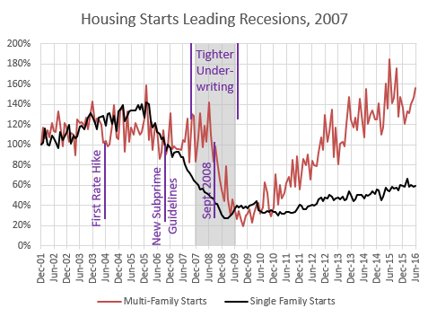2008: The mortgage crackdown in the federal mortgage agencies, which further pushed single-family activity into a deep and novel decline while multi-family activity remained stable. By September 2008, the effect of the agency crackdown and the Fed’s ignorance of the depth of the damage from it finally caused a broader crisis and market crash, and multi-family activity finally crashed, not because of housing market conditions, but because of a general financial breakdown and sudden lagged deepening of the recession.