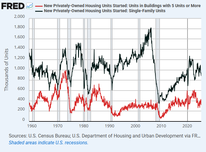 Even with all of the dislocations since 2020 - a global pandemic, double digit inflation, whipsaw interest rates, bloated construction timelines, etc. - total production has been flat, and volatility has been mostly about trading market share between single- and multi-family starts.