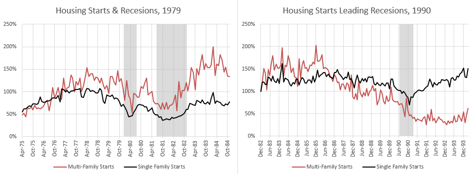This continues in 1979 and 1990. However, in the 1990 cycle, the decline was very protracted. And multi-family starts never fully recovered to mid-20th century rates of activity.