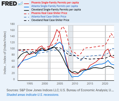Phoenix has the most demand, so there was more rent and price appreciation there, and as prices rose, supply conditions loosened, and permits increased. Prices and rents had to rise for permits to increase.