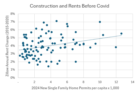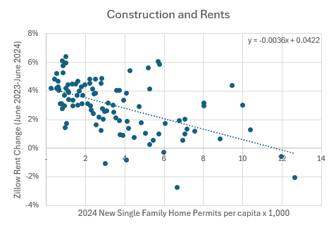 Figure 1 shows single-family permitting rates and the one-year change in rents. This is the largest 92 metro areas that don’t have a functionally vertical supply curve (NYC, LA, San Francisco, etc. are excluded).