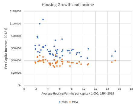 PS. By the way, I happened upon this old chart that shows permitting rates among the 49 largest metro areas and per capita incomes. Notice that there was little variation in per capita income across cities in 1994. And, where incomes have become notoriously high, it has uniformly been in the cities with the least new housing permits.