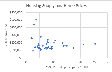 Think of the price of homes as the accumulation of all previous price changes. Here, I’m going to reach back to before all the 21st century nonsense. Figure 3 shows the permitting rate in 1999 and Zillow’s ZHVI home price estimate for 49 metropolitan areas in 2000. Those dots up at the top left are the cities I left out of Figures 1 and 2. If every city had completely inelastic supply, then the plot would just be a vertical line that those dots would be in the midst of. Almost all cities have local supply conditions that allow for new supply to equal demand over time. So, there is little difference in price appreciation between cities that permit 3 units per thousand residents per year and those that permit 25.
