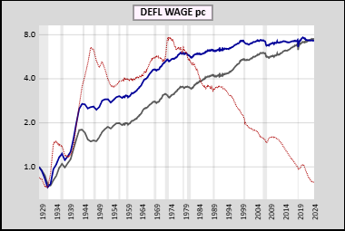 There are 4 clear eras. From 1930 to the end of World War II, consumption of housing increased at about the same pace of growth in the consumption of other goods and services, but rents (at least as they were measured at the time) didn’t rise nearly as much as prices on other goods and services, so the line moved down vertically.