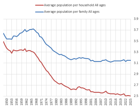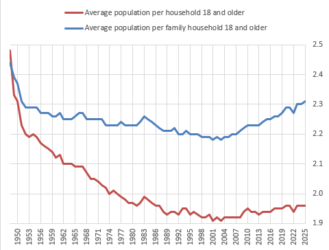 Figure 4 shows adults per household. The rise in adults per family in the last 20 years has erased 40 years worth of the previous downward trend.