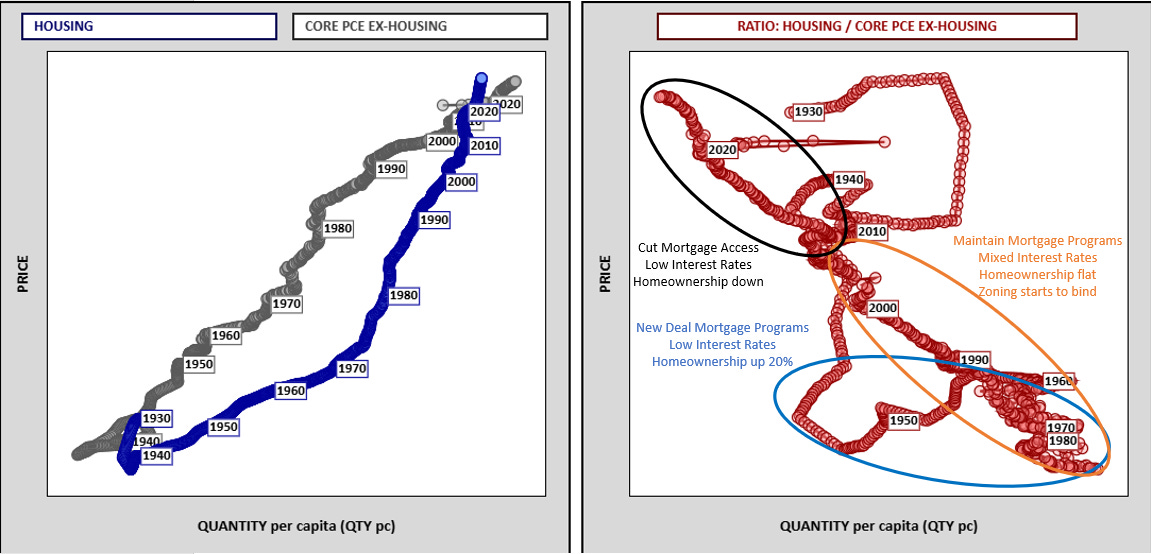 In the right panel, the red line is the ratio. If we increase our consumption of housing relative to everything else, the line moves to the right. If we have to pay more for housing than we have to pay for everything else (if rent inflation is higher than other inflation), then it moves up.